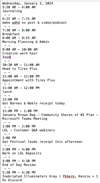 In case you’re wondering, the hidden warning from the ChatGPT oracle that I missed was in the “packed schedule” comment. Everything went great up until the appointment to get my tires — then there had been some mis-communications between their phone appointment system and the actual stores, that threw off both my schedule and my mood. The delay had a cascading effect, and while I made most of my meetings and did get things done, the emotional regulation required to manage my growing frustration with both systems and my own brain was exhausting.