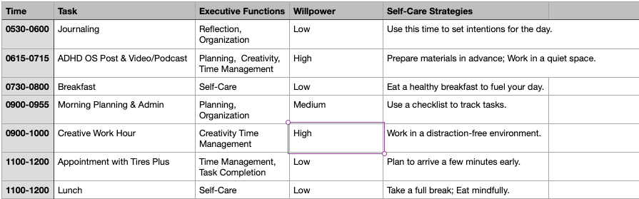 • Morning Planning & Admin (9:00 AM — 9:55 AM): Executive Functions: Planning, organization. Willpower: Medium (requires focus and organization)